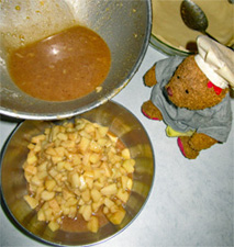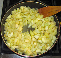 When steamy/bubbly, remove the skillet from the stove. Let stand 10 minutes. While the apples are cooling, coat a glass pie baking dish with baking spray. Place the base pie shell in the dish. Spread it out carefully. Using a slotted spoon, move the apples into a large mixing bowl. Discard any liquid remaining in the skillet. Add the sugar/spice mixture and mix well.
