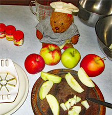 Prepare sugar/spice mixture: In a small mixing bowl, add the sugar, raw sugar, cinnamon, apple pie spice, nutmeg, and salt. Mix together. Set aside. Prepare the thickeners: In a cup, mix the flour and corn starch together. Set aside. Peel and core apples. Chop into 1cm pieces. As you put the apples in a bowl, sprinkle some lemon juice on them and mix. Lemon juice prevents the apples from turning brown (oxidizing.) Place a large skillet on the stove at medium heat. Add the butter. When butter is melted, add the apples.