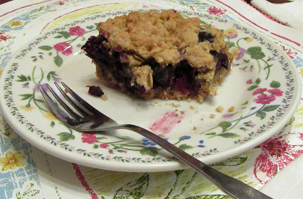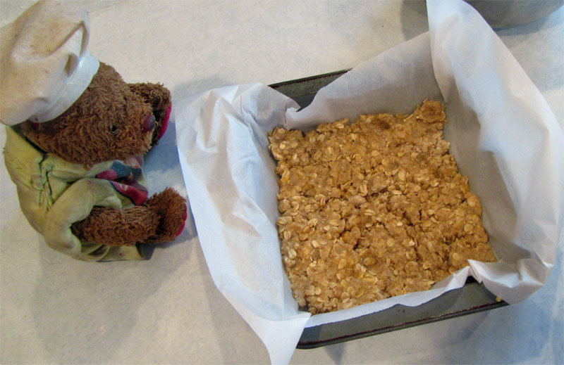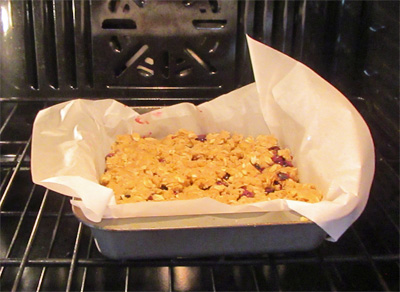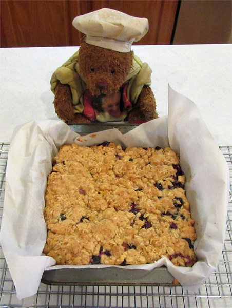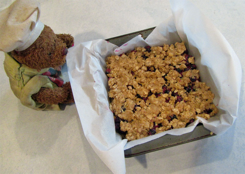 1. Insert parchment paper on a 9 x 9 x 2 inch baking pan. 2. Spread 1/2 of the base on the bottom of the baking pan. 3. Add and spread the blueberry mixture on top of the base in the pan. 4. Crumble by hand the remaining base mixture on top of the berry layer. Fill or spread out to cover the berry layer as best you can.