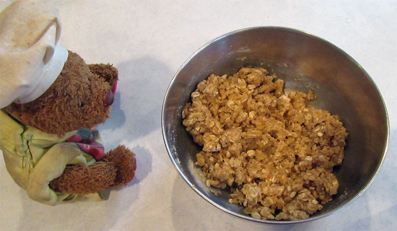 Put all dry ingredients for the base into a large mixing bowl -- flour, oats, granulated sugar, natural sugar, brown sugar, baking soda, baking powder, salt, and cinnamon. Melt the stick of unsalted butter in a microwave. Don't boil or burn the butter. Pour melted butter over the dry mixture, add egg yolk, and mix together completely by hand (do not use a mixer; the base needs to have oat texture). Remove about half of the base and place it into the cup used to melt the butter. Set aside.