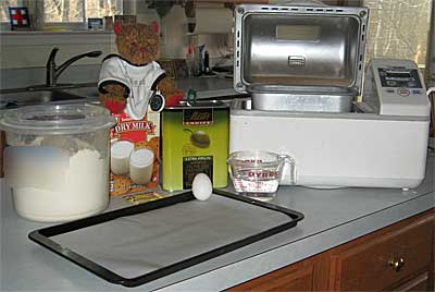 Istruzioni per prepararsiIt is easiest to make the dough using a bread machine. Set the machine to "manual" or "dough" setting. Put all ingredients except cornmeal and coarse salt into the bread pan. Turn machine on. Check dough as it mixes, scraping sides of the bread pan to ensure all ingredients mix. Make sure it is not too wet or dry; adjust with flour or water if necessary.