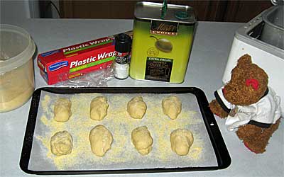Form each piece of dough into a rectangular shape. Dust lightly with flour. Place each roll about 2" apart onto a parchment paper-lined baking sheet dusted with cornmeal. With a serrated knife, make a slash about 1/4" deep down the middle of each roll. | |