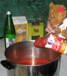 Place the pot on the stove over medium heat. Stir the sauce mixture. Keep on medium heat until the first bubbles appear. Then reduce heat to simmer. Simmer the sauce for two hours, stirring about every 20 minutes to keep it from sticking to the bottom of the pot.