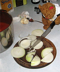 Remove outer peel of onion. Slice off both ends. Cut 1/4" slices of onion, the cut slices in half. Pick apart the onion by hand and drop it into the sauce mixture.