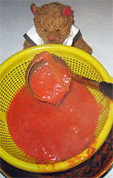 Remove from heat. Let stand for about 30 minutes to cool. Using a colander, strain the sauce into another pot or bowl to separate the onions and garlic from the sauce. If you're brave enough, you can eat the onions and garlic separately.
